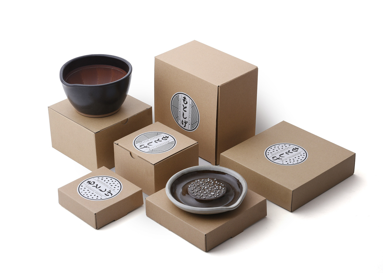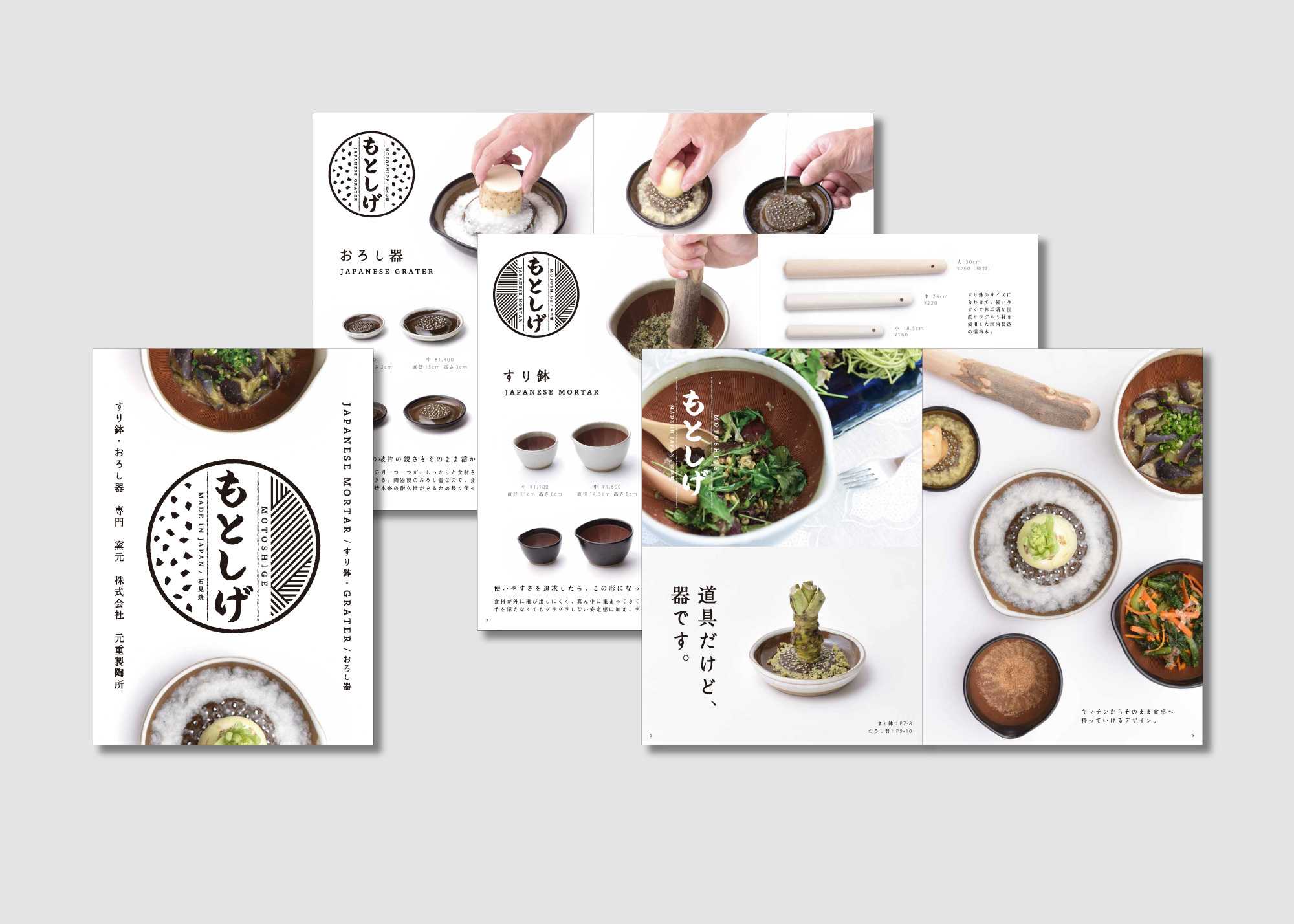 元重製作所の専務が日々試行錯誤する中、社内では孤立化してしまい、外からの情報も少なく、悩んでいました。我々は生産量を減らして利益率を上げるにはどうしたら良いか、どんなことにこだわるべきか、既存の販路とは別の販路を作るにはどうしたら良いかなど、酒の席を借りていろんな実体験を元に自然な形でアドバイスしていきました。そして専務の努力で素晴らしい商品が完成しました。そこからその素晴らしい商品の周辺を取り巻くブランド全体のデザインや海外展開を手伝わせていただくことになります。また既存の販路のお客さんに悪影響のないように専務が頭になる別ブランド「もとしげ」をデザインしました。すり鉢とおろし器をメインに製造している会社と一目でわかり、海外でもそのまま使えるよう英文字を組み合わせた新たにロゴをデザインし、展示会でのブース、パンフレット、webなどをブランドに関わるもの全てを製作させていただきました。現在海外販路開拓と卸を担当する形でお付き合いを継続的にさせていただいています。