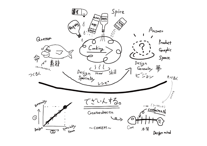 つまり、Coelacanthとは目に見えない本質が魚の名前になっているということです。デザインの本来の意味は見た目や色などではなく、本質的なことを捉えそれを表現したり問題解決したりすることですので、この名前に共感したことが由来になります。